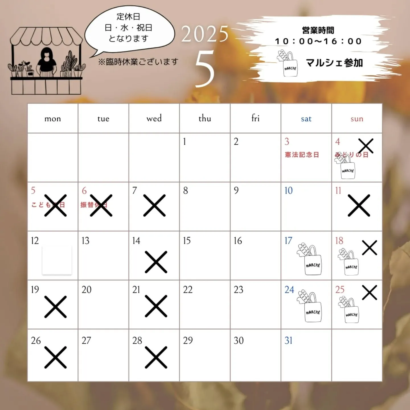 ですが、今月はイベント出店の振替もあり、月曜日もお休み多めです。